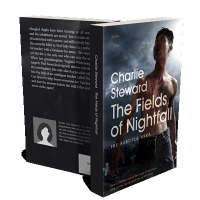 “A shirtless, dirty man stands against a dark, stormy background with a faint town in the distance.”
