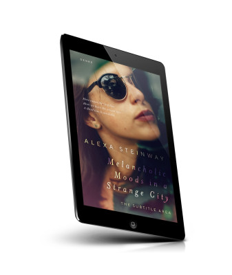 “A woman in sunglasses looking upwards with text overlaid detailing a book cover titled "Melancholic Moods in a Strange City" by Alexa Steinway.”