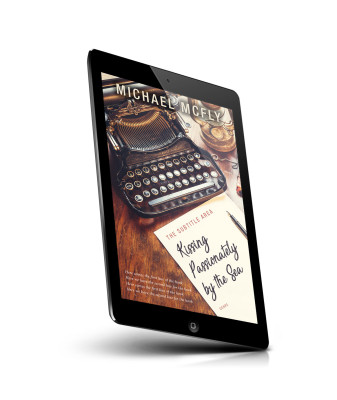 “An old typewriter on a wooden table with a paper titled "Kissing Passionately by the Sea" and a pen nearby.”