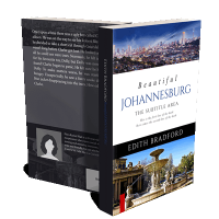 “A book cover featuring Johannesburg's cityscape at dusk above and a grand fountain in front of an elegant building below.”