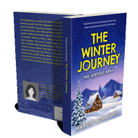 “a snowy landscape with a house and a tree”