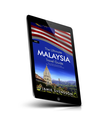 “Book cover featuring a Malaysian flag, a temple, and lush green hills. Title reads "The Ultimate Malaysia Travel Guide".”