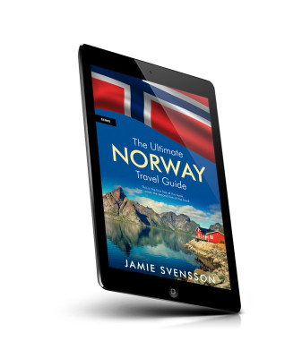 “A travel guide cover featuring a Norwegian flag, a picturesque landscape with mountains, water, and a red cabin.”