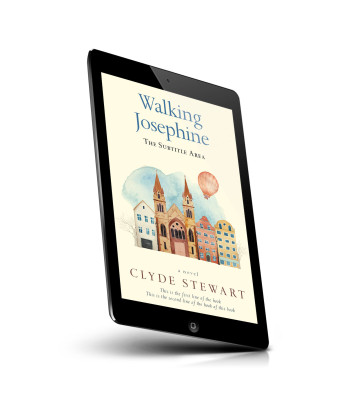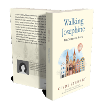 “Illustrated book cover with colorful buildings, a hot air balloon, and the title "Walking Josephine" at the top.”