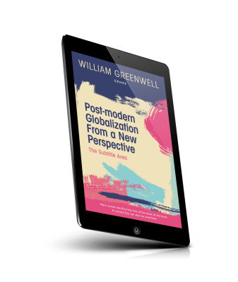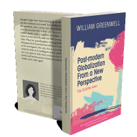 “A book cover with an abstract design, featuring splashes of pink, blue, and cream, and bold text about "Post-modern Globalization."”