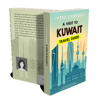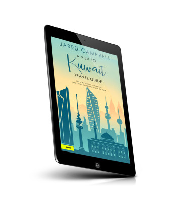 “Illustrated skyline of Kuwait with modern skyscrapers and traditional buildings, under a clear sky with the sun rising or setting.”