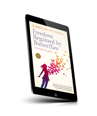“Silhouette of a woman with colorful butterflies flying around her on a light background.”