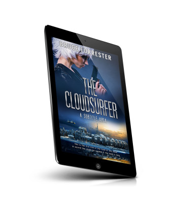 “A futuristic-themed cover with a person holding a gun and a sci-fi cityscape in the background.”