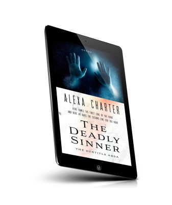 “Hands pressing against foggy glass atop a book cover for "The Deadly Sinner" by Alexa Charter.”