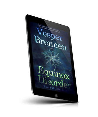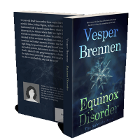 “Abstract blue and green background with overlaid geometric shapes, showcasing the title "Equinox Disorder" by Vesper Brennen.”
