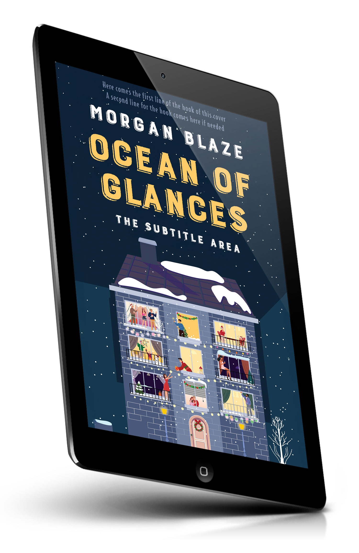 Tags: night, building, snow, festive, winter, romance, illustration, lights, family, windows, celebration, cozy, holiday, warm, neighborhood, apartment, community, stories, snowflakes, decorations, premade cover, book cover design, self-publishing, ebook cover, print ready