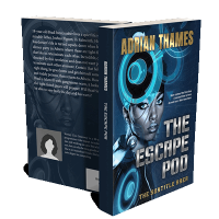 “A futuristic book cover featuring a woman adorned with metallic accessories, blue tech motifs, and bold title text "The Escape Pod."”