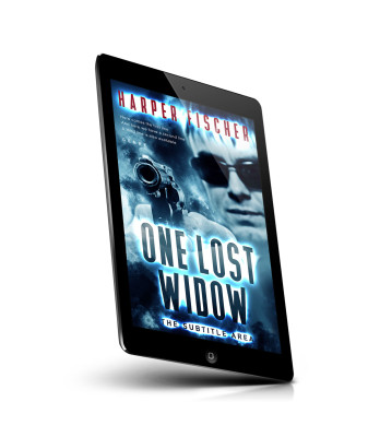 “A person in sunglasses points a gun directly at the camera, with the book title "One Lost Widow" prominently displayed below.”