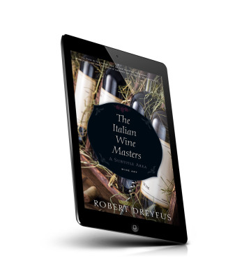 “A close-up of wine bottles with decorative straw and a round label titled "The Italian Wine Masters" by Robert Dreyfus.”