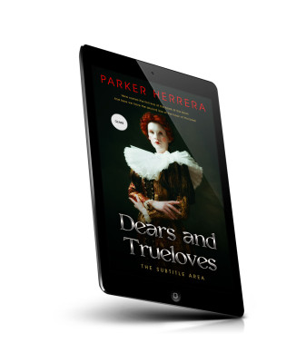 “A woman with pale skin and red hair wearing an elaborate ruffled collar and historical attire, set against a dark background.”