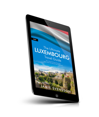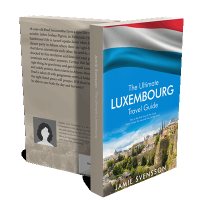 “A travel guidebook cover with an image of Luxembourg's skyline, featuring a mix of old and modern buildings under a vibrant sky.”
