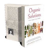 “Book cover showing various organic foods like seeds, nuts, and vegetables arranged in vertical stripes.”