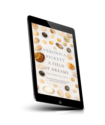 “Seashells of various shapes and colors are scattered across a light background, with text about a book titled "A Field of Dreams" by Veronica Pickett.”