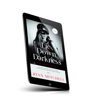 “A woman wearing a mask, on the cover of a book titled "Lie Down Darkness" by Ryan Mitchell.”