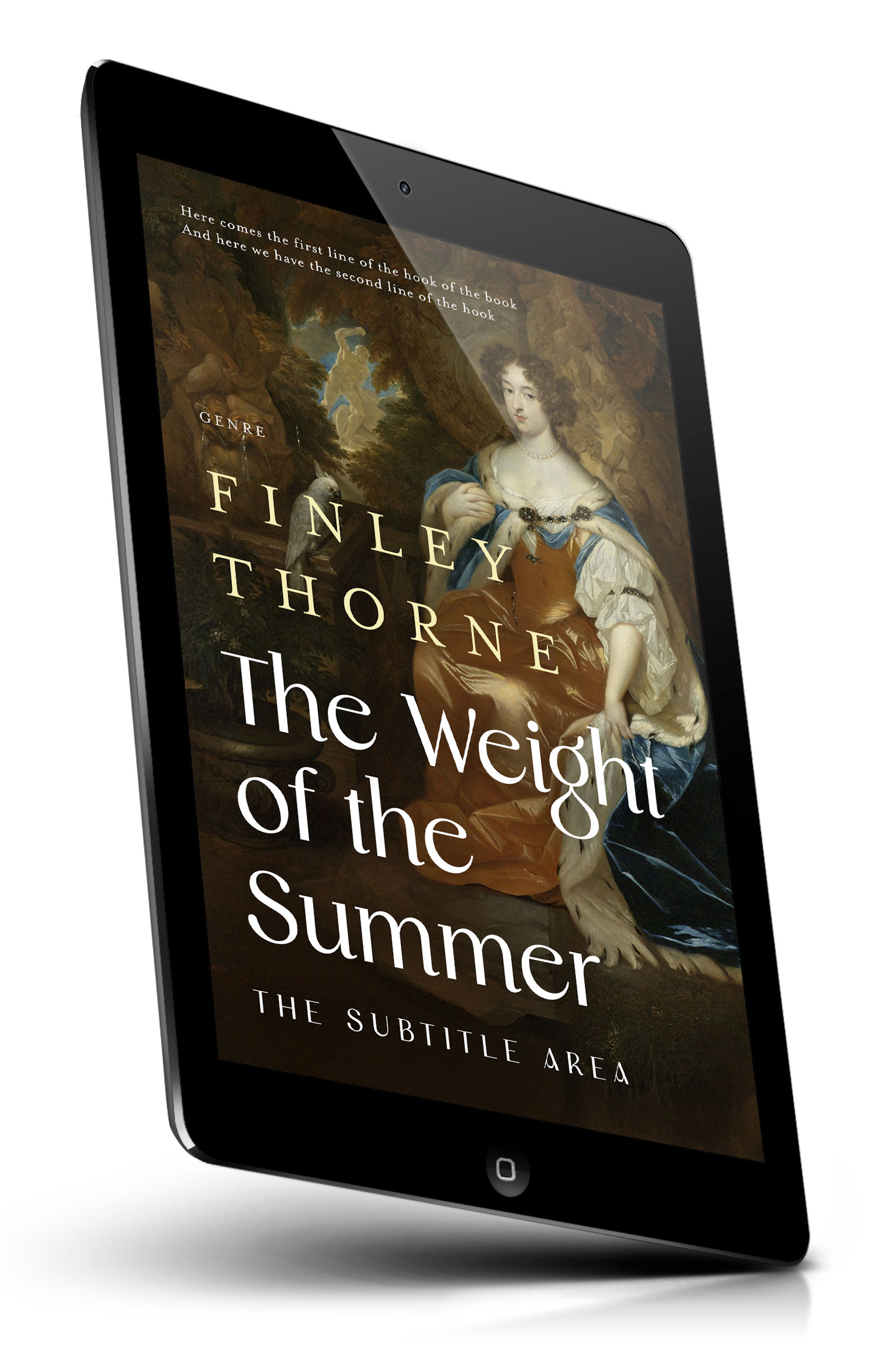 Tags: baroque, oil painting, portrait, noblewoman, aristocratic, vintage, classical art, historical fiction, period drama, regal attire, satin gown, pearl necklace, fur stole, dramatic lighting, garden backdrop, cherub statue, still life, ornate typography, muted palette, elegant design