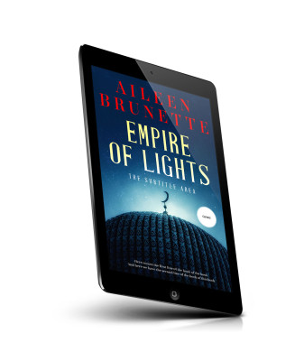 “A crescent sits atop a dome against a starry night sky, with bold text in red and yellow displayed above and over the dome.”