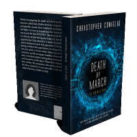 “Futuristic book cover with a blue digital circuit pattern and a gold seal.”