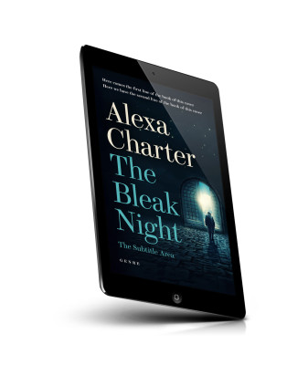 “A figure stands near an arched doorway under a starry sky, with text overlay for a book titled "The Bleak Night."”