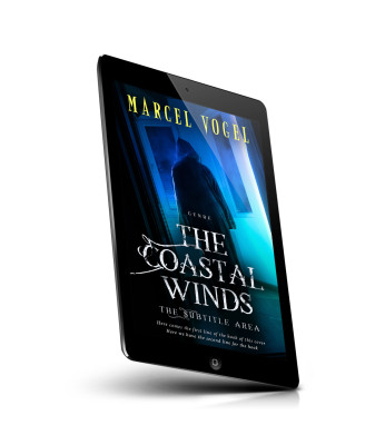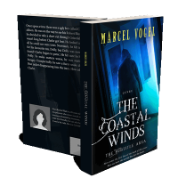 “A shadowy figure in a hooded cloak stands in a dimly lit room by a window, with the text "The Coastal Winds" prominently displayed.”