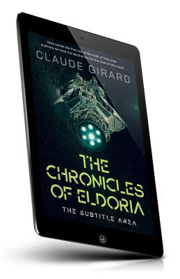“A spaceship flying through space with the title "The Chronicles of Eldoria" in bold futuristic font at the bottom.”