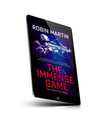“A futuristic soldier aiming with a high-tech weapon. Title of the book in bold red letters with author's name at the top.”