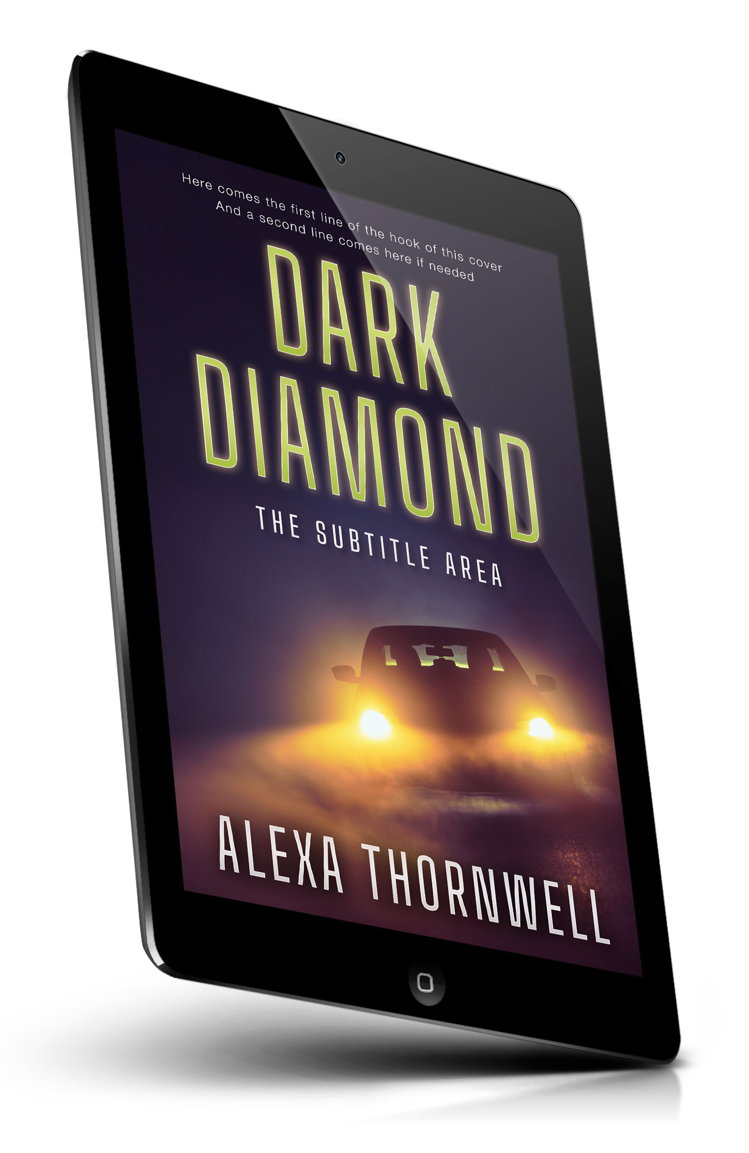 “A car drives through fog at night, headlights cutting through mist on a dark, moody background like a thriller book cover.”