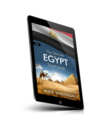 “A travel guide cover featuring the Egyptian flag, pyramids, and a person on a camel in the desert.”