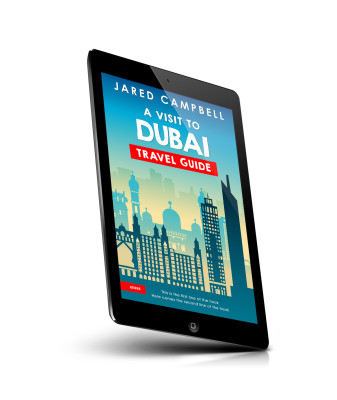 “An illustrated book cover for a Dubai travel guide, featuring a city skyline with iconic buildings and a blue gradient background.”