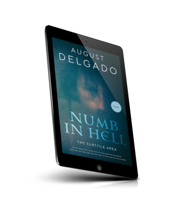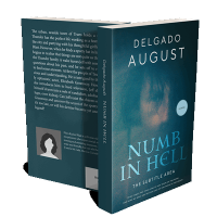 “A book cover with a dark, blurry image and large title text "Numb in Hell" by August Delgado.”