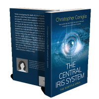 “A blue-toned book cover featuring a digital eye design and a gold genre badge near the bottom left corner.”