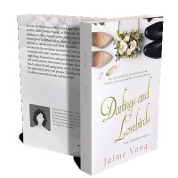 “A book cover featuring shoes, rings, a floral arrangement, and the title "Darlings and Lovebirds" by Jaime Vong.”