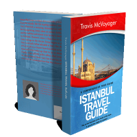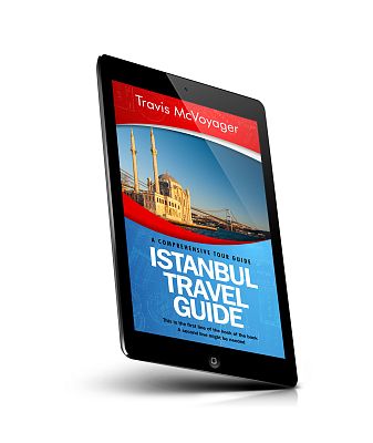“The image features a travel guide cover with a mosque, a bridge, and blue and red sections.”