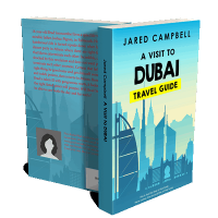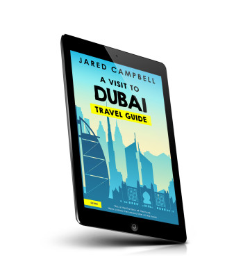 “A cityscape with skyscrapers, including the Burj Al Arab, against a gradient blue sky. It's a travel guide cover for Dubai.”