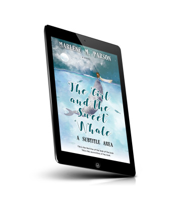 “A girl sits on a whale under a moonlit sky, surrounded by water and distant boats.”