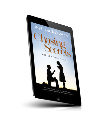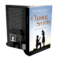 “A silhouetted man kneels before a standing woman against a twilight sky background with the title "Chasing Secrets."”