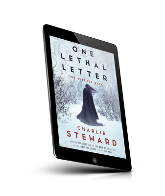 “A person in a dark cloak walks through a snowy forest, with ornate swirls in the corners of the image.”
