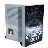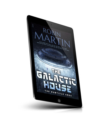 “A person stands beneath a hovering spaceship on a snowy surface. The title "The Galactic House" is prominent in futuristic font.”