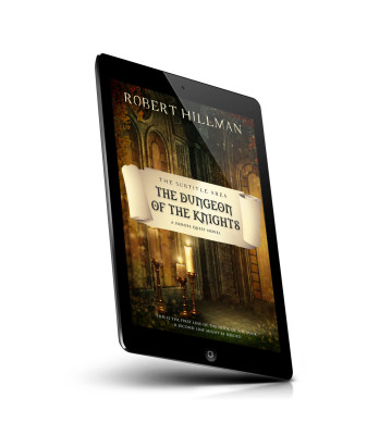 “A medieval-themed book cover with a grand arched doorway, lit candles, and ornate scroll design.”