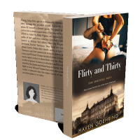 “A woman in lingerie is handcuffed on a bed. Below is an image of an old mansion.”