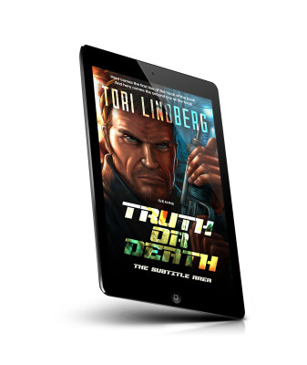 “A cinematic-style book cover featuring a rugged man holding a gun, in a futuristic setting with bold, vibrant title text.”