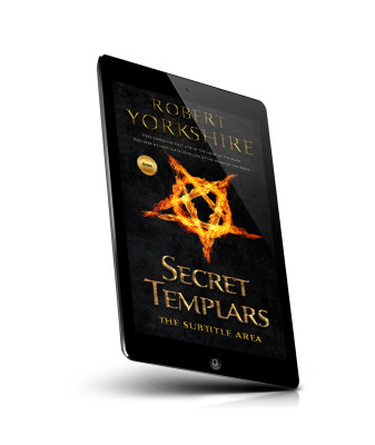“Fiery pentagram and bold gold text on a dark background.”