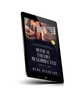 “A person plays a small stringed instrument, possibly a ukulele, on the cover of a book titled "Musical Theory Resurrected."”