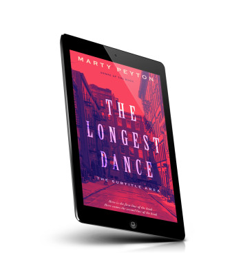 “Tall buildings line a city street with a pink and purple overlay, featuring bold title text prominently in the center.”