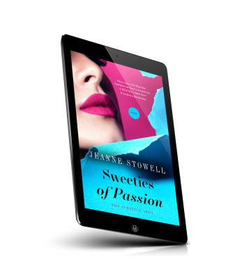 “A close-up of a woman with bright pink lipstick against a vivid blue and pink torn background. Title "Sweeties of Passion" is prominent.”