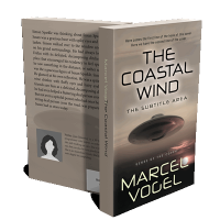 “A book cover features a flying saucer over a coastal landscape with a cloudy sky, with minimalist text design.”